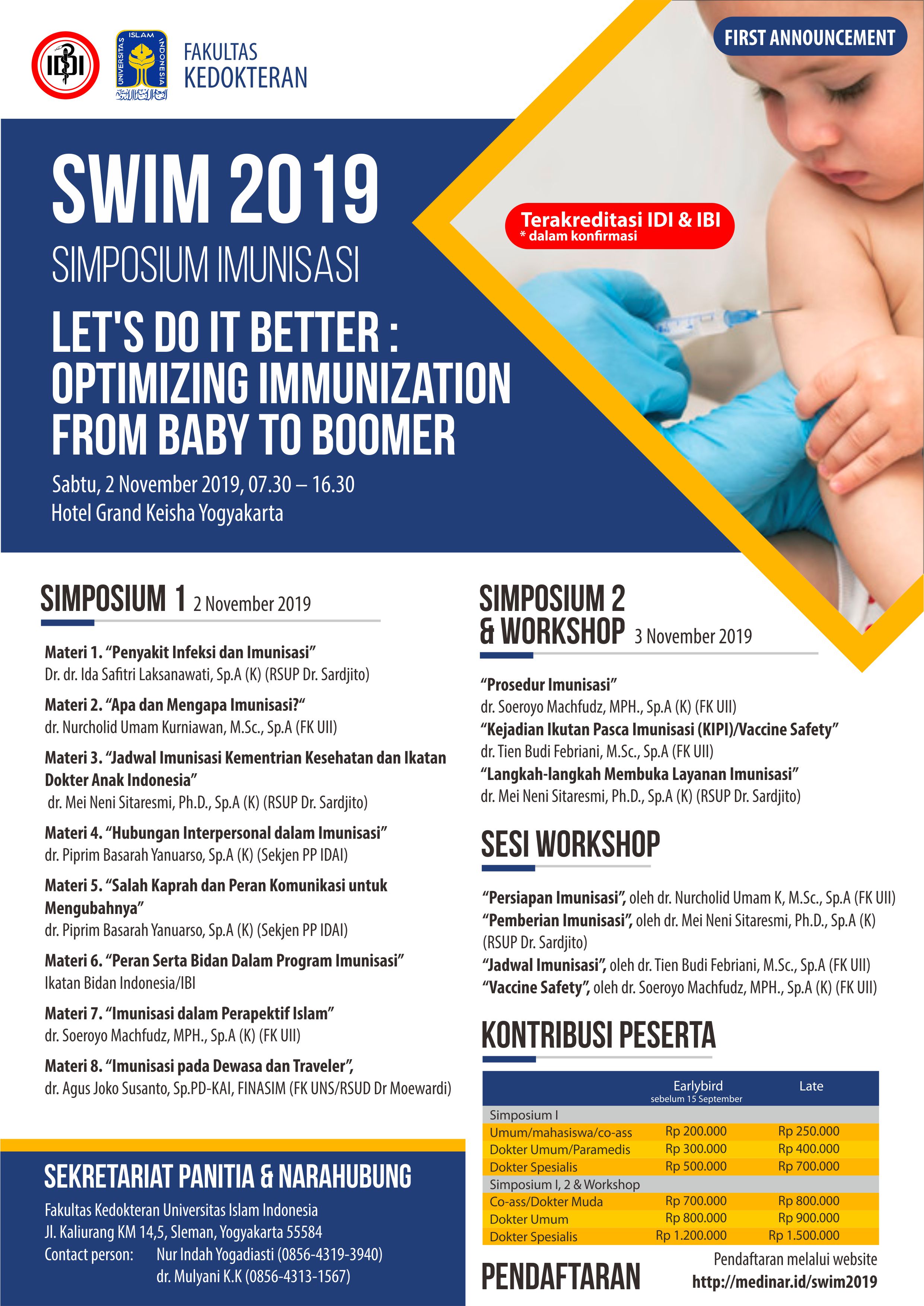 Simposium Imunisasi “SWIM” 2019 berisikan review pengetahuan dasar meliputi penyakit-penyakit yang dapat dicegah dengan imunisasi, pengenalan jadwal imunisasi terbaru dari depkes dan IDAI 2017, kontroversi, miskonsepsi dan komunikasi dalam vaksinasi, pengenalan terhadap jenis vaksin, distribusi vaksin, penyimpanan vaksin, prosedur dan tata cara pemberian vaksin, serta pengelolaan kejadian ikutan pasca imunisasi (KIPI) beserta problematika terkini terkait vaksin palsu dan jenis-jenis vaksin baru. Sehingga diharapkan setelah mengikuti SWIM 2019 ini, para dokter/tenaga kesehatan memiliki pengetahuan dan keterampilan yang mumpuni terkait imunisasi serta mampu menjadi pencerah bagi masyarakat dalam menjawab berbagai isu negatif terkait imunisasi.