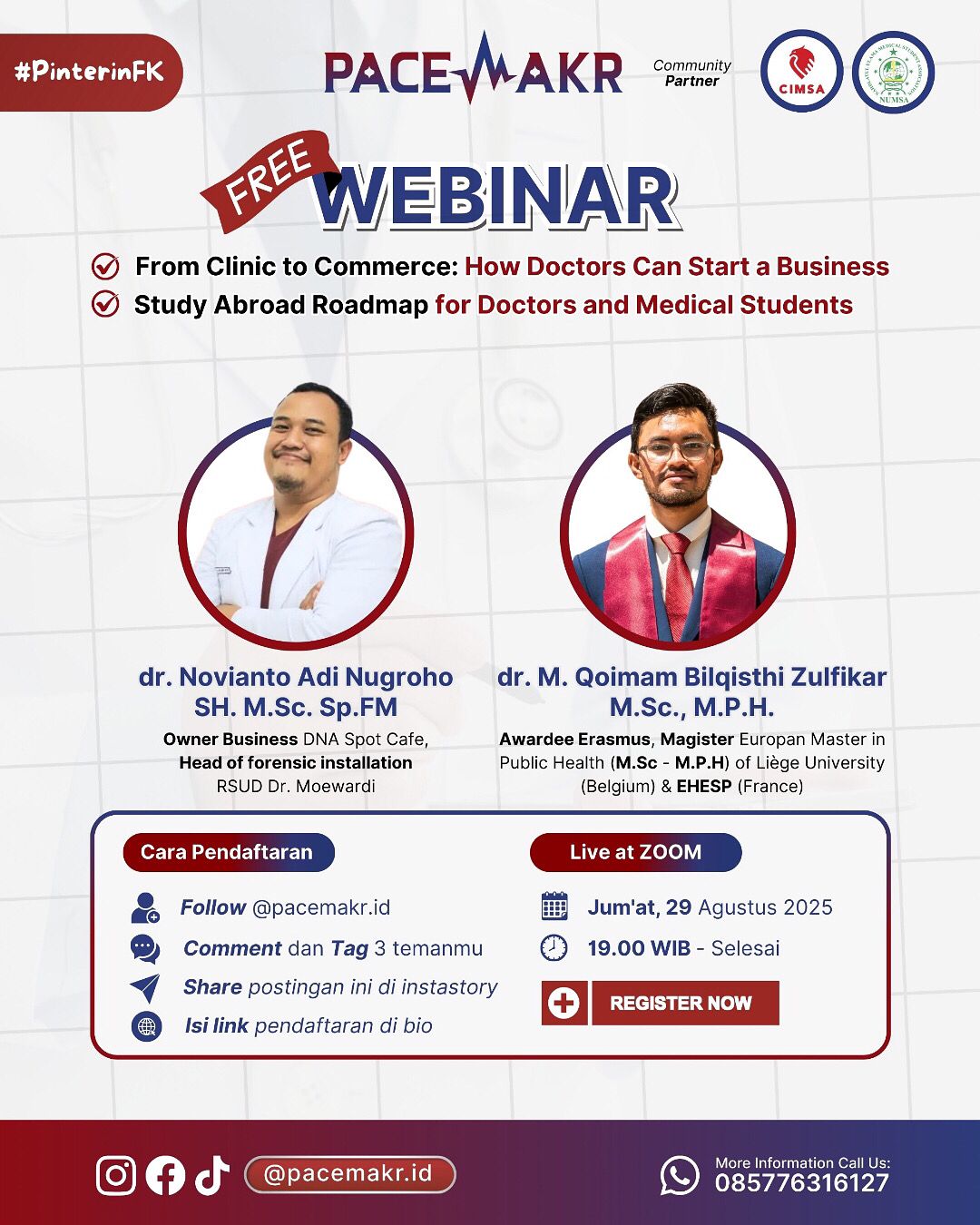 Webinar ini bertujuan untuk meningkatkan pengetahuan dan awareness dokter dan tenaga kesehatan lainnya mengenai pentingnya memulai bisnis dan juga pentingnya untuk studi di luar negeri demi peningkatan kompetensi.