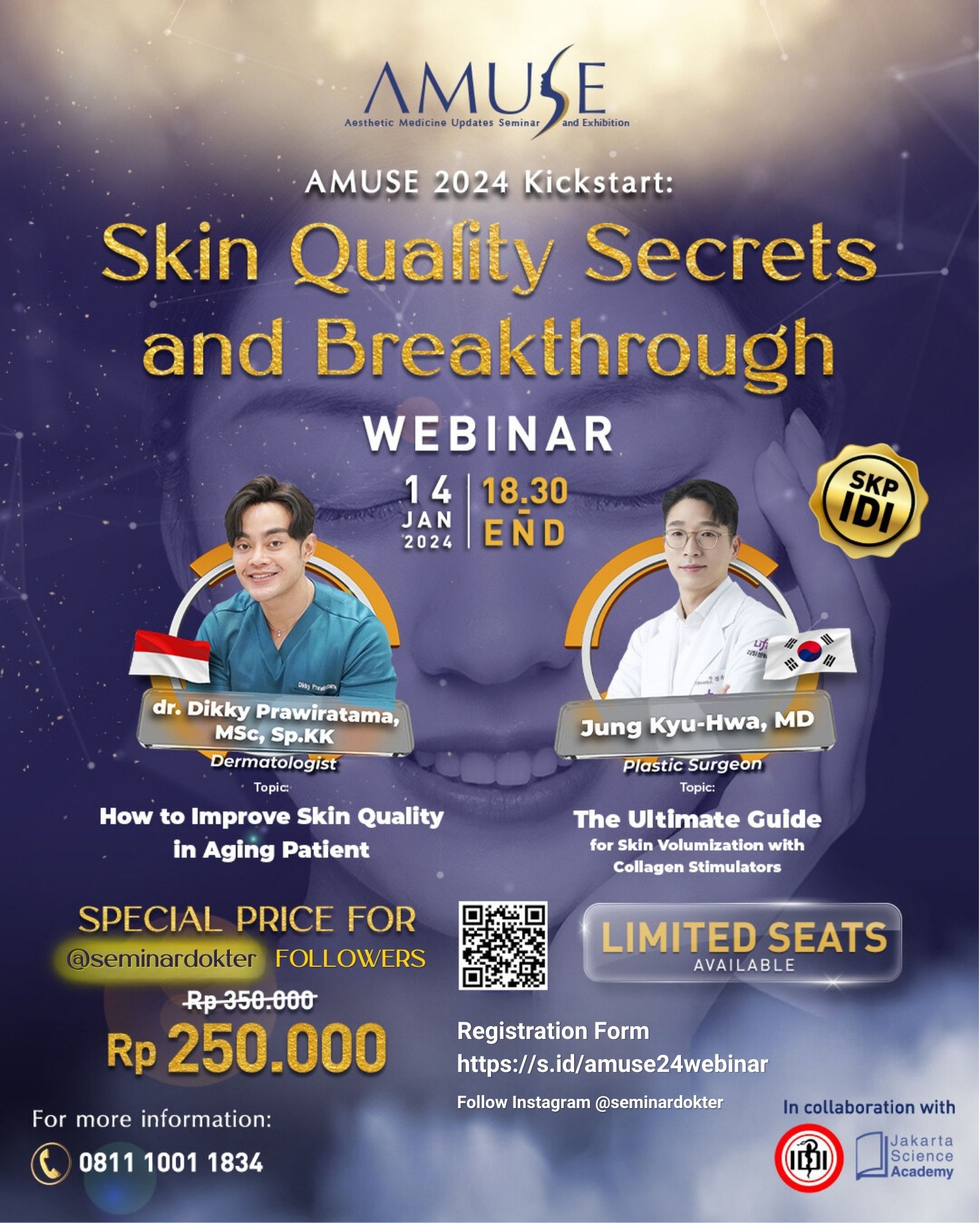 Unlock the Secrets to Perfect Skin! Join us for the exclusive AMUSE 2024 webinar where Dr. Dikky Prawiratama, MSc, Sp.KK, a seasoned dermatologist, and Dr. Jung Kyu-Hwa, MD, a plastic surgeon, reveal the latest breakthroughs in achieving flawless skin quality. Dive into in-depth insights and top-notch solutions for healthier, radiant skin. Don't miss out on this extraordinary opportunity!"