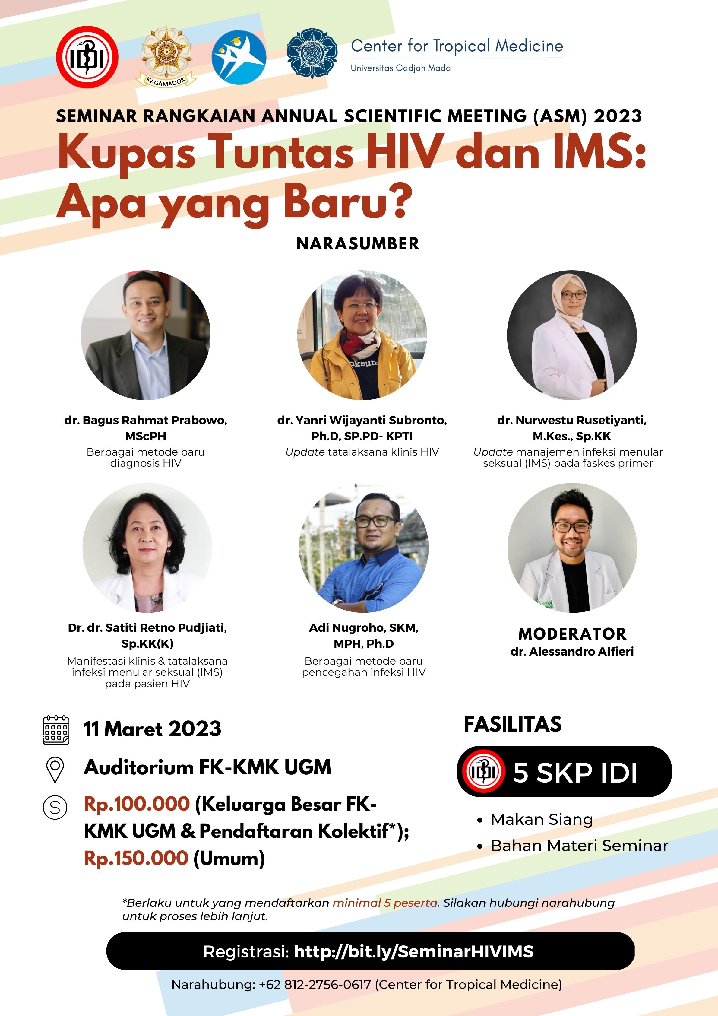 Dalam rangkaian pelaksanaan Annual Scientific Meeting (ASM) Fakultas Kedokteran, Kesehatan Masyarakat, dan Keperawatan (FK-KMK) UGM. Pusat Kedokteran Tropis mengadakan seminar yang bertajuk "Kupas Tuntas HIV dan IMS: Apa yang Baru?" pada:
