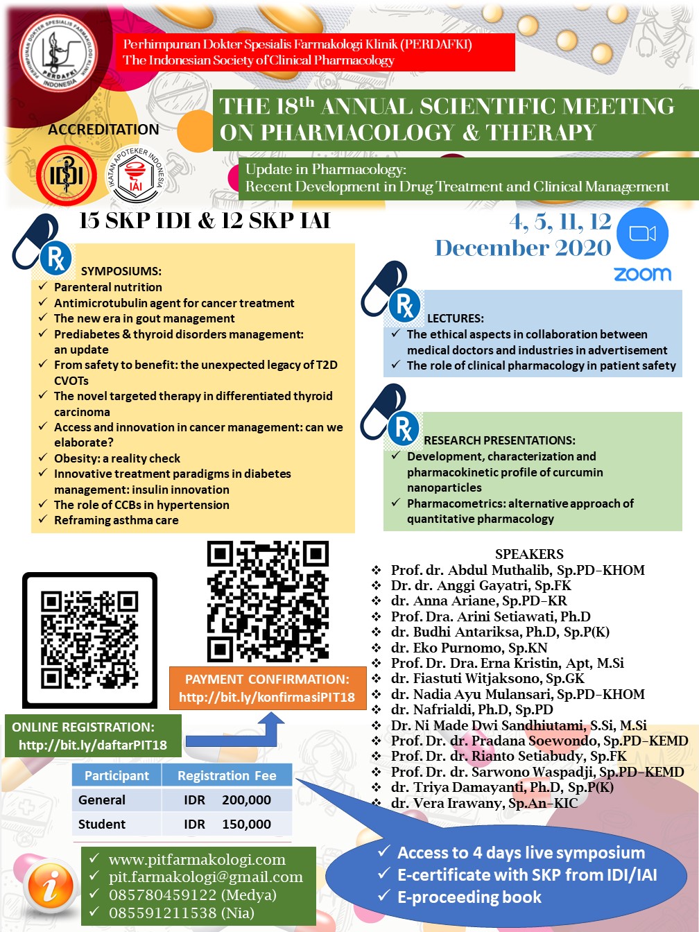 Perhimpunan Dokter Spesialis Farmakologi Klinik Indonesia (PERDAFKI) bekerja sama dengan Yayasan Pengembangan Farmakologi & Terapi menyelenggarakan The 18th Annual Scientific Meeting on Pharmacology & Therapy secara online melalui aplikasi ZOOM pada tanggal 4,5,11,12 Desember 2020. Terakreditasi 15 SKP IDI dan 12 SKP IAI.
