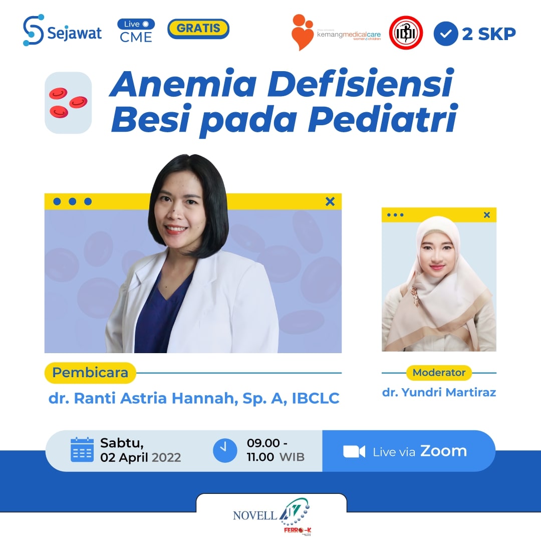 #TemanSejawat , ketahui diagnosis dan penanganan anemia khususnya anemia defisiensi besi pada pediatri bersama dr. Ranti Astria Hannah, Sp. A, IBCLC pada: