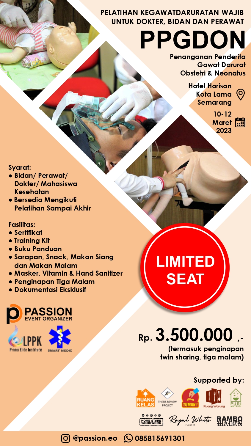 Mengulang kesuksesan event sebelumnya di 15 kali pelaksanaan event PPGDON, Passion Event Organizer berkomitmen untuk bekerjasama dengan para ahli di bidangnya membuat sebuah program Pelatihan Penanganan Penderita Gawat Darurat Obstetry & Neonatus (PPGDON) dengan materi menyangkut kasus-kasus yang sering terjadi di lapangan dan memerlukan penilaian dan penanganan segera, antara lain: