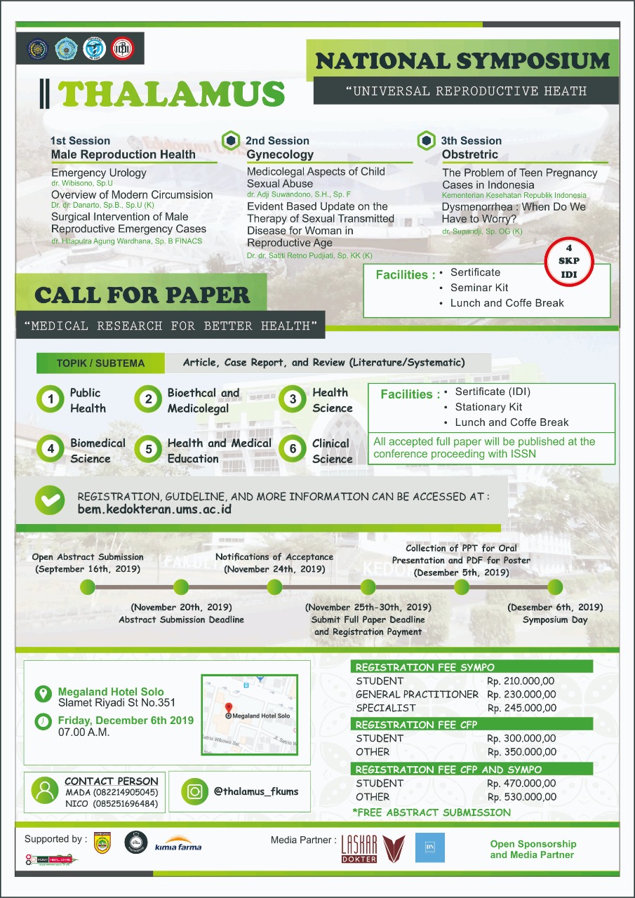 Thalamus is an even from Medical Faculty Muammadiyah Surakarta University. This event consists of Symposium with themes " Universal Reproductive Health" and Call For Paper with themes " Medical Research for Better Health".