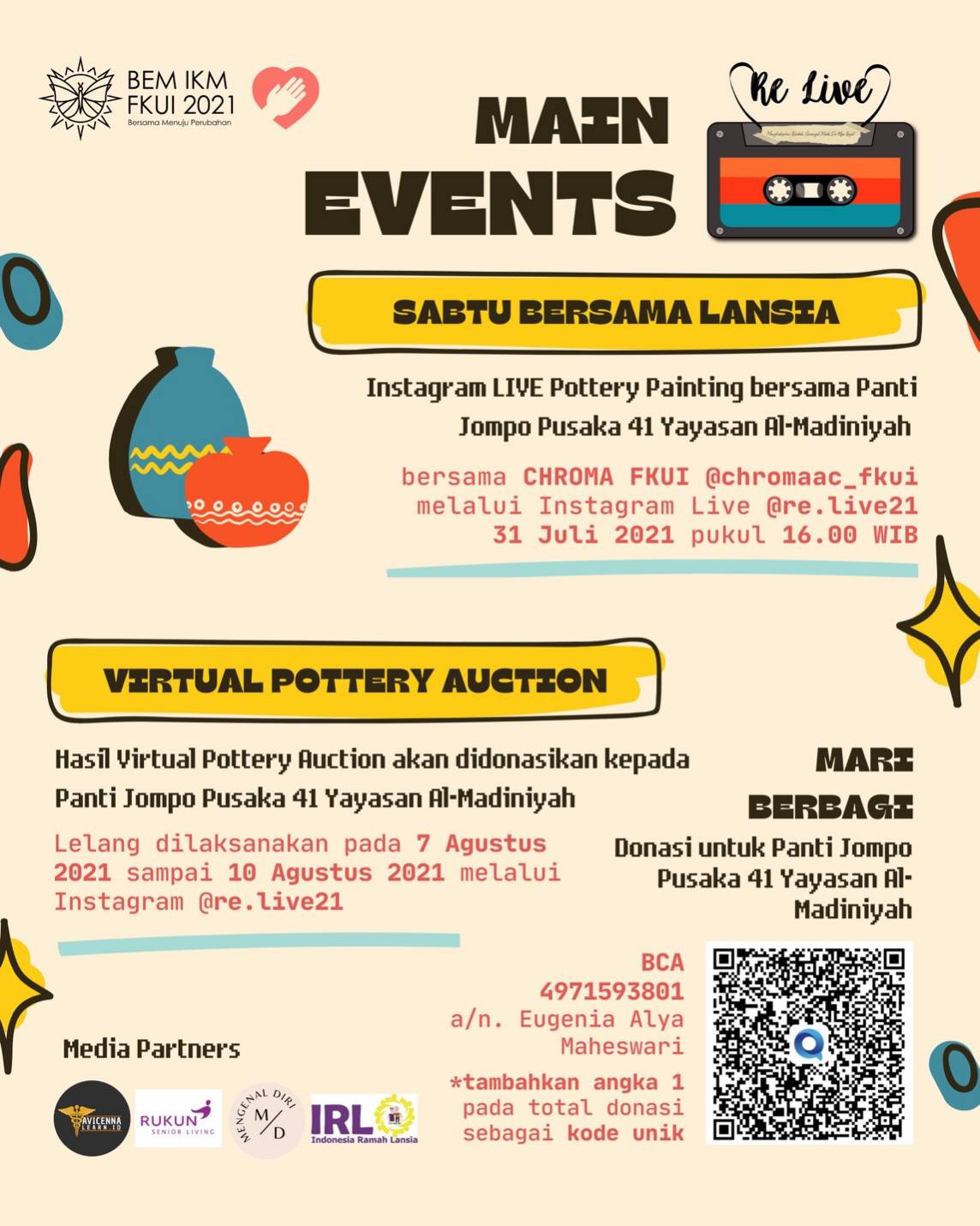 ReLive adalah program kerja yang terdiri atas berbagai bentuk kegiatan, yaitu 🗣️Sharing Session, 🎨Pottery Painting, ⚱️Virtual Auction, 📢Air Campaign, dan 💸Open Donation.