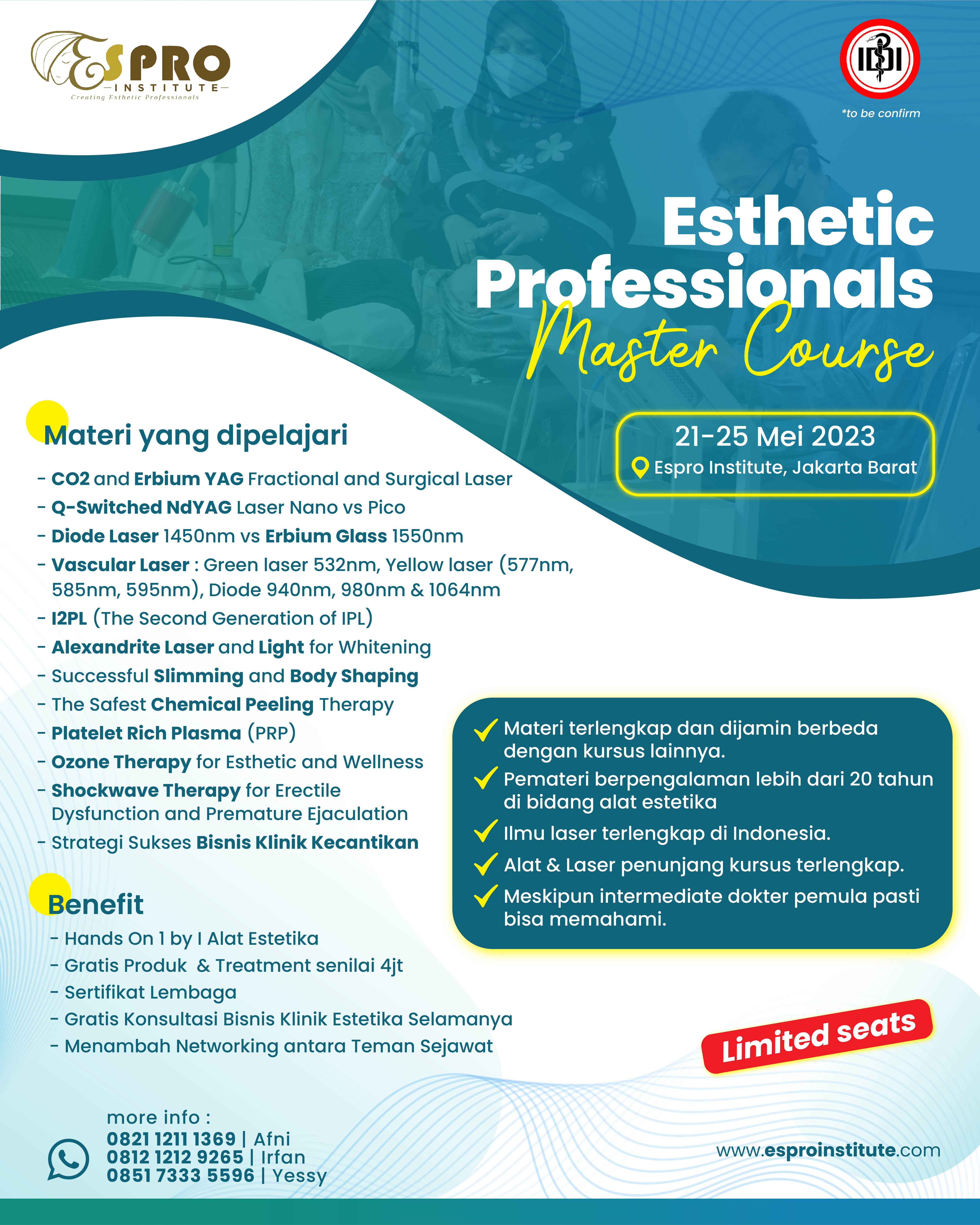 Kursus ini merupakan Inovasi Pedia dan Sukses Pedia buat para dokter dan owner klinik kecantikan yang bosan dengan kliniknya yang sulit berkembang. Kursus Estetika Memberikan terobosan dan ide-ide baru bagaimana mengembangkan klinik anda. Dan Bukan sekedar belajar estetik dasar.