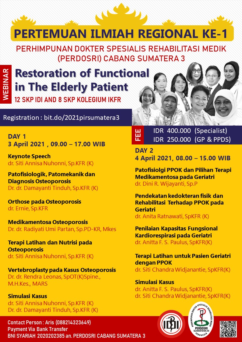 Perhimpunan Dokter Spesialis Kedokteran Fisik dan Rehabilitasi (PERDOSRI) Cabang Sumatera 3 akan menyelenggarakan Pertemuan Ilmiah Regional (PIR) ke-1 dengan tema Restoration Of Functional in the Elderly Patient melalui media Webinar pada Tgl 3-4 April 2020