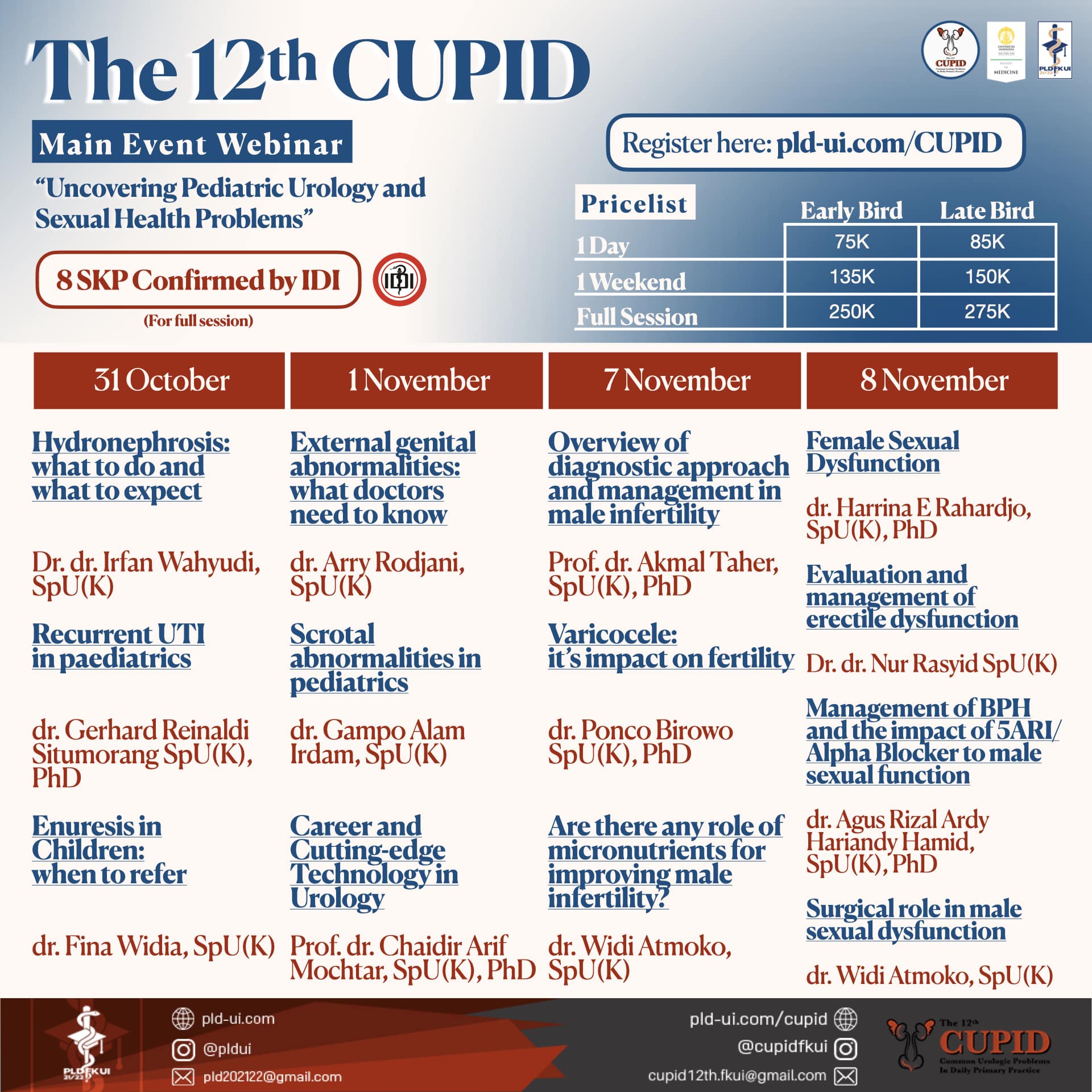 Presenting Pediatric Urology and Sexual Health Problems as our main theme this year, we are pround to announce that Main Webinars of The 12th CUPID 2020 is now open for registrations. Don’t miss out the chance to get a comprehensive review on pediatric urology and sexual health problems from urology consultant of FKUI-RSCM only at The 12th CUPID 2020.