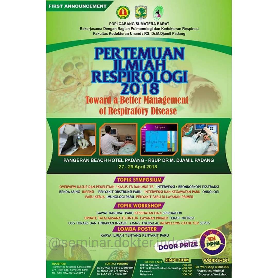 Kami PDPI cab sumbar bekerjasama dengan program studi pulmonologi dan kedokteran resporasi FK UNAND mngadakan acara simposium dan workshop dengan tema "toward a better management respiratory diseases" yg akan diadakan tgl 27-29 april 2018 d pangeran beach hotel. Terakreditasi IDI dan PPNI.