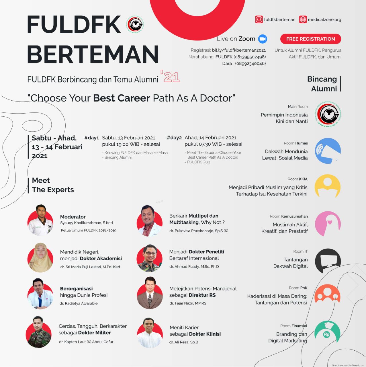 FULDFK BERTEMAN kali ini hadir dengan Temu Alumni FULDFK yaitu bincang bersama alumni dari masa ke masa dan Meet The Experts yaitu membahas beragam profesi dokter yang disampaikan oleh ahli dalam bidangnya.