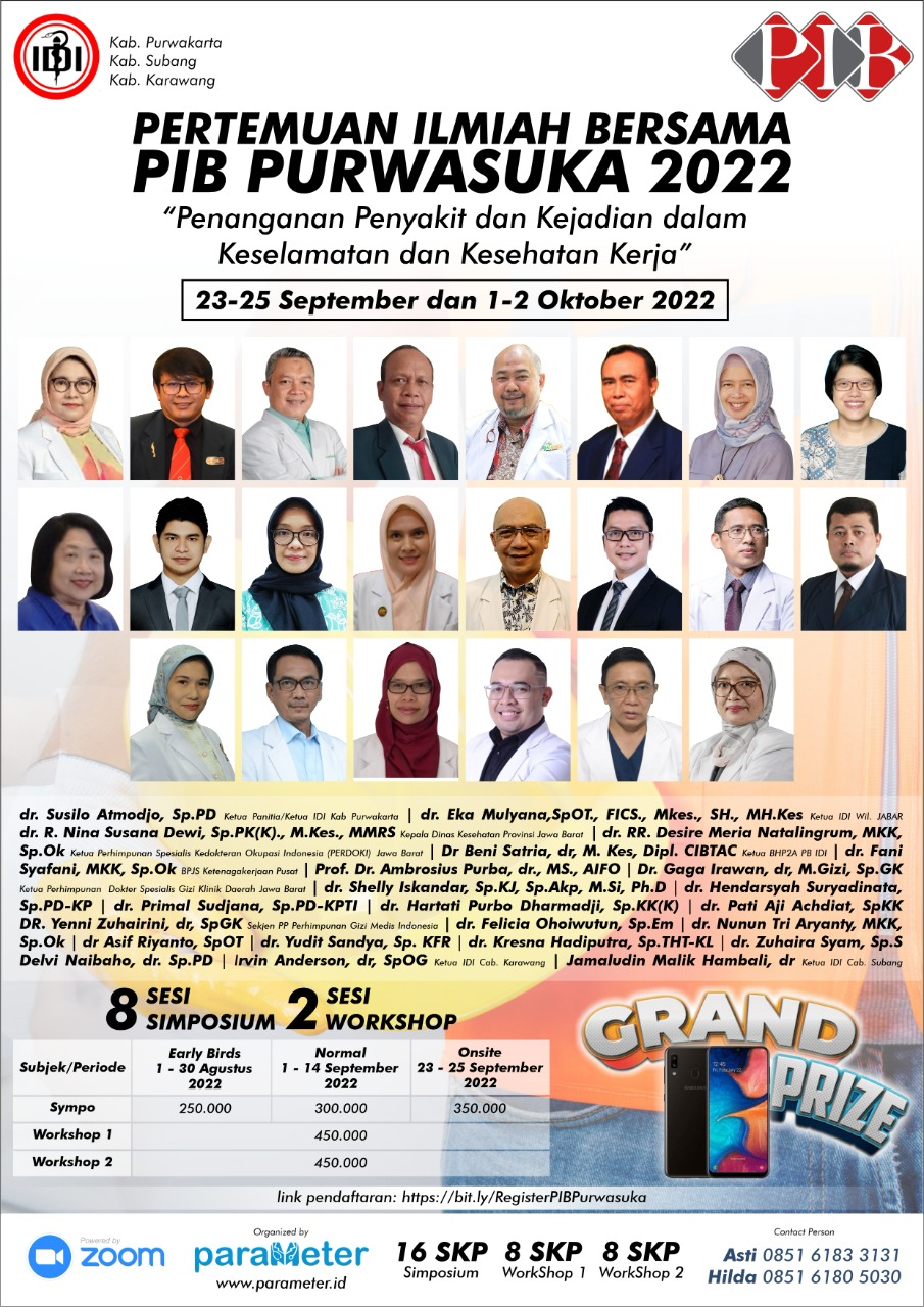 Menyikapi hal tersebut, sebagai media dalam upaya meningkatkan kewaspadaan (awareness) dan peningkatan pengetahuan/kemampuan maka IDI PURWASUKA yang terdiri dari Cabang Kabupaten Purwakarta, Cabang Kabupaten Subang dan Cabang Kabupaten Karawang berprakarsa menyelenggarakan kegiatan Pertemuan Ilmiah Bersama (PIB) dengan mengangkat tema Penanganan Penyakit dan Kejadian dalam Keselamatan dan Kesehatan Kerja, pada :