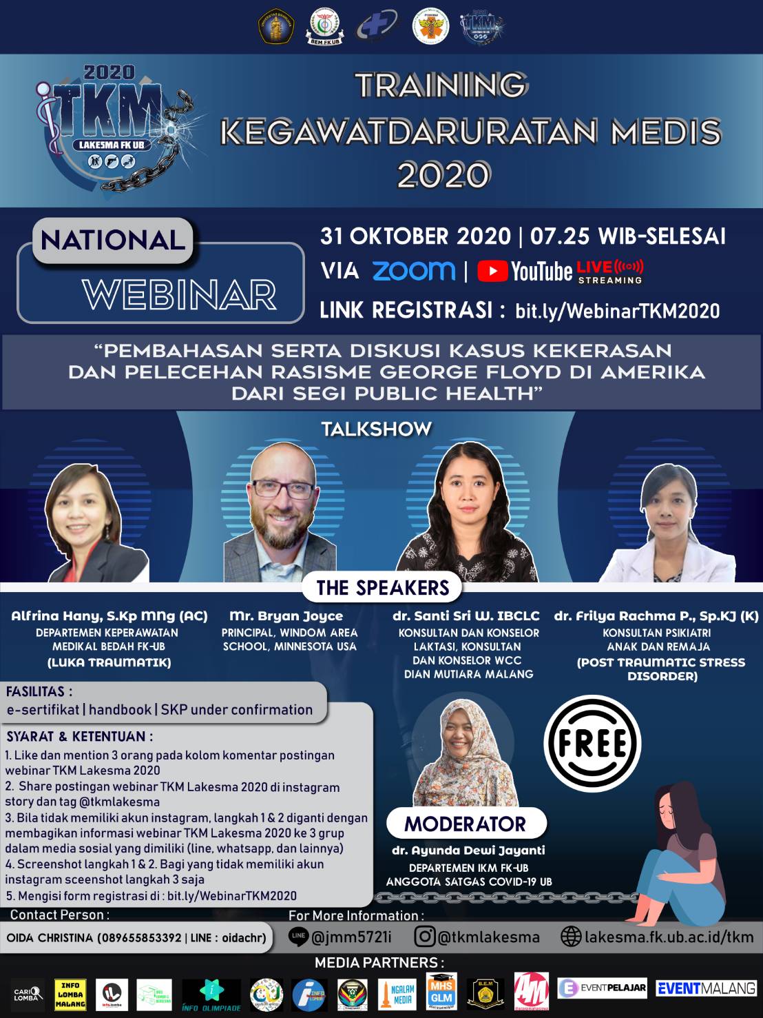 Judul untuk Webinar TKM 2020 adalah "Pembahasan serta Diskusi Kasus Kekerasan dan Pelecehan Rasisme George Floyd di Amerika dari Segi Public Health". Pastinya materi-materi akan disampaikan oleh dokter serta tenaga ahli di bidangnya!😊
