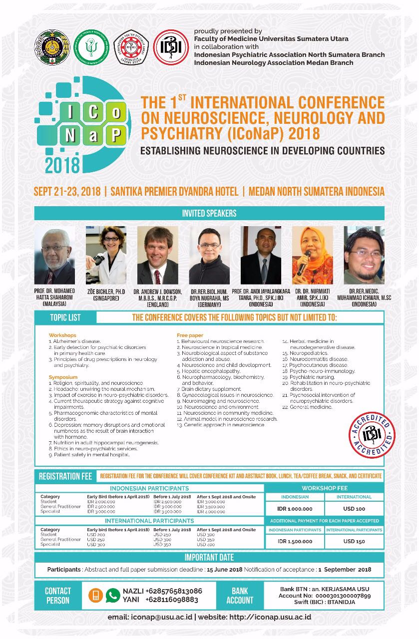 Neuroscience is an emerging branch of science that develops rapidly. It needs neurology, psychiatry, and psychology for us to understand it better. The aim of this conference is to educate and learn the current trends and research in neuroscience education. Next year, Faculty of Medicine University of Sumatera Utara will hold the International Conference on Neuroscience, Neurology, and Psychiatry at University of Sumatera Utara (ICoNaP USU) which highlight the emerging neuroscience advances in neurology, psychiatry, psychology, pharmacology, physiology, biology and other medical sciences. This conference will target 300 participants from around the world, presenting state-of-the-art scientific presentations, delivered by both well-known international and national speakers; aiming to provide a forum to share the latest research, exchange the new emerging knowledge, discuss the recent problems and challenges especially in Neuroscience, Neurology, and Psychiatry, as well as to discuss the future development and provide a networking opportunity for clinicians, researchers and experts working in those fields.