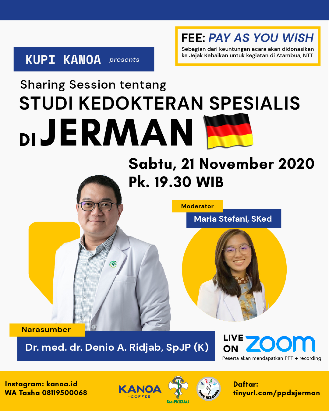 KUPI KANOA ☕️ perdana yang bekerjasama dengan Jejak Kebaikan menghadirkan Dr.med.dr. Denio A. Ridjab, SpJP(K) untuk sharing bersama kita seputaran kehidupan studi spesialis di Jerman! Yuk ikutan daftar!💯💯💫