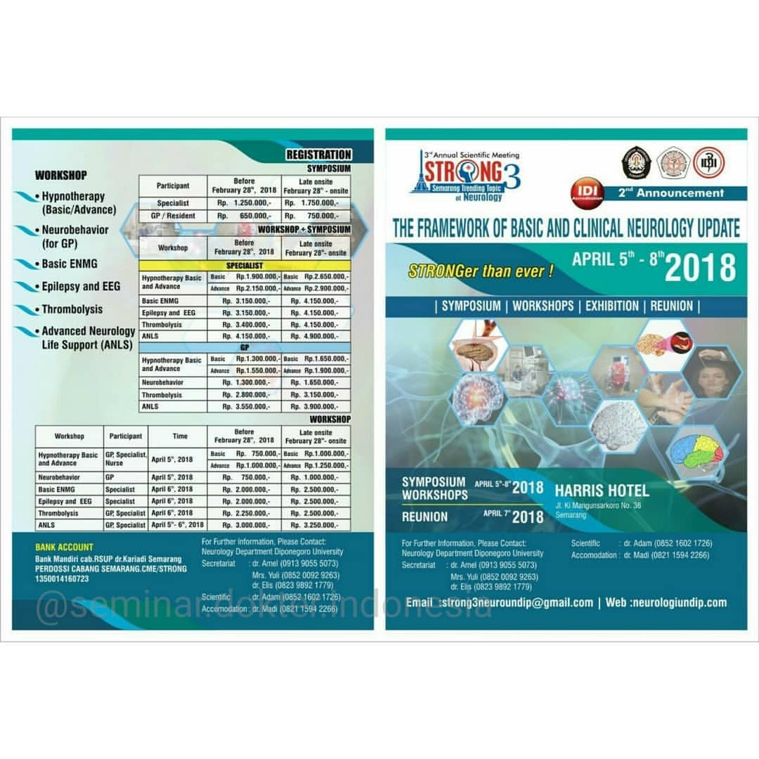 3rd Annual Scientific Meeting Semarang Trending Topic (STRONG) of Neurology bertemakan "The Framework of Basic and Clinical Neurology Update" akan diadakan pada tanggal 5 April - 6 April 2018. Kegiatan ini diselenggarakan oleh Neurology Department Diponegoro University di Harris Hotel, Semarang.