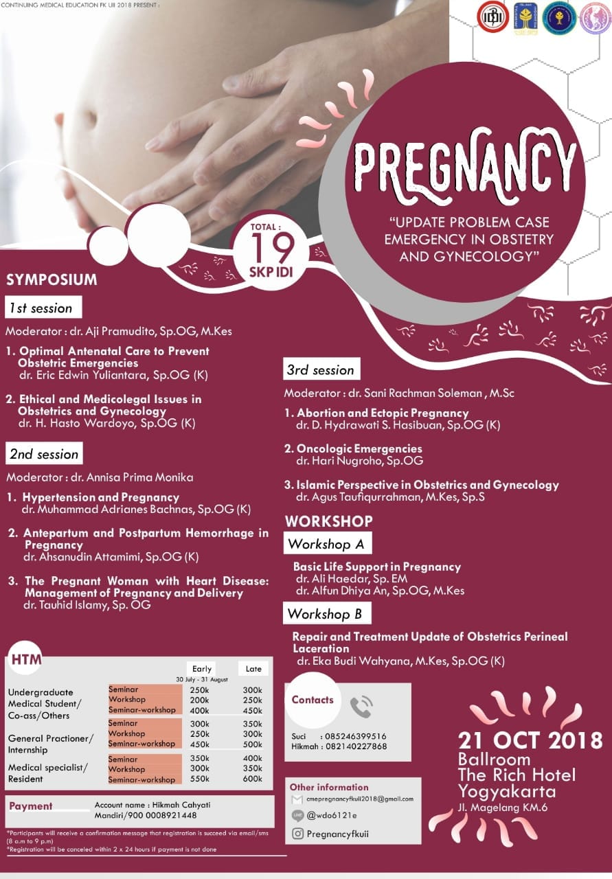 PREGNANCY merupakan sarana bagi tenaga kesehatan untuk memahami apa saja kegawatan yang dapat terjadi pada ibu hamil serta bagaimana cara penanganannya, dengan seminar ini diharapkan mampu meningkatkan wawasan dan pemahaman dalam menangan kasus kegawatdaruratan terutama di bidang obstetri dan gynecologi.