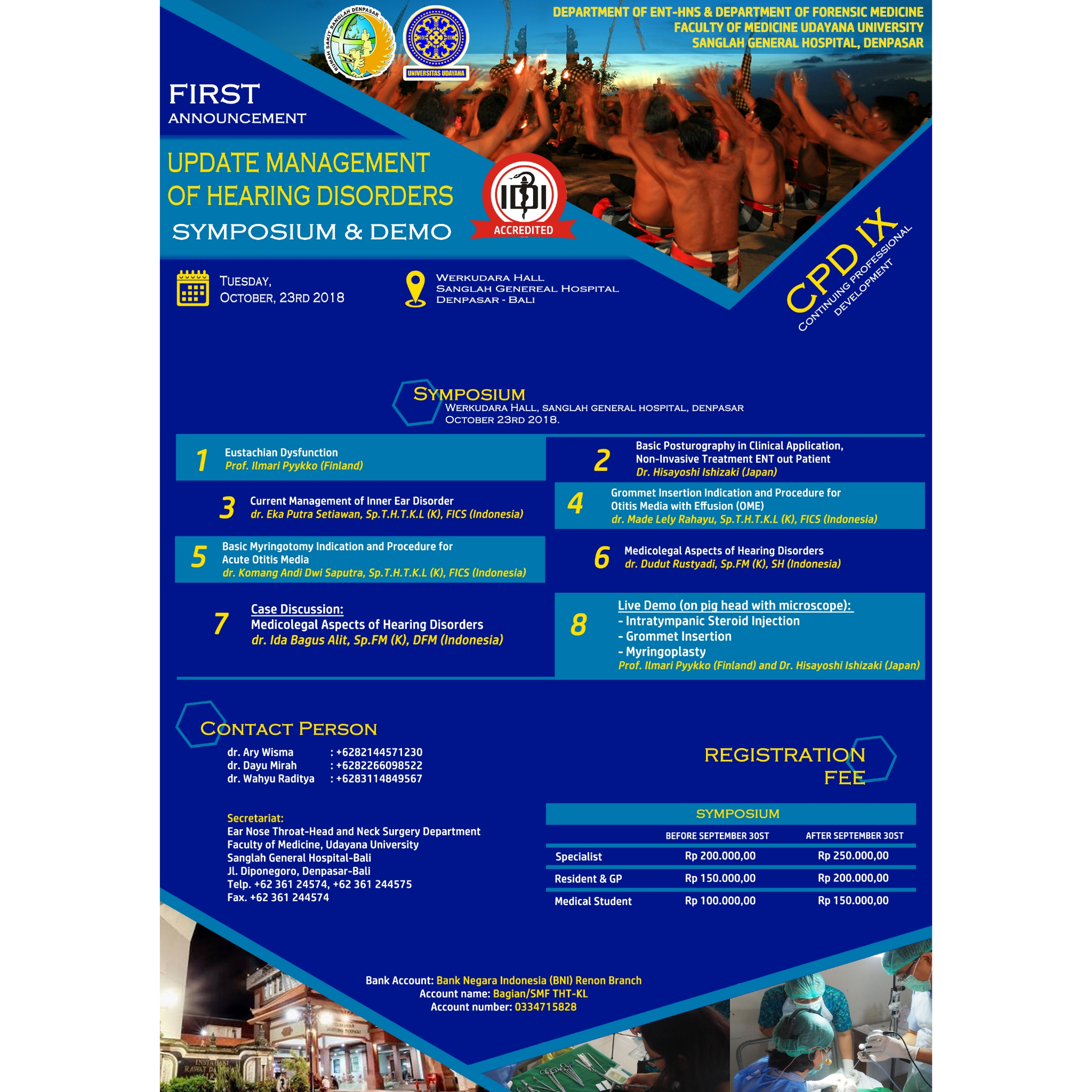 Departemen/KSM Ilmu Kesehatan THT-KL bekerja sama dengan Departemen/KSM Ilmu Kedokteran Forensik FK UNUD/RSUP Sanglah, dengan bangga mempersembahkan "Continuing Professional Development IX"