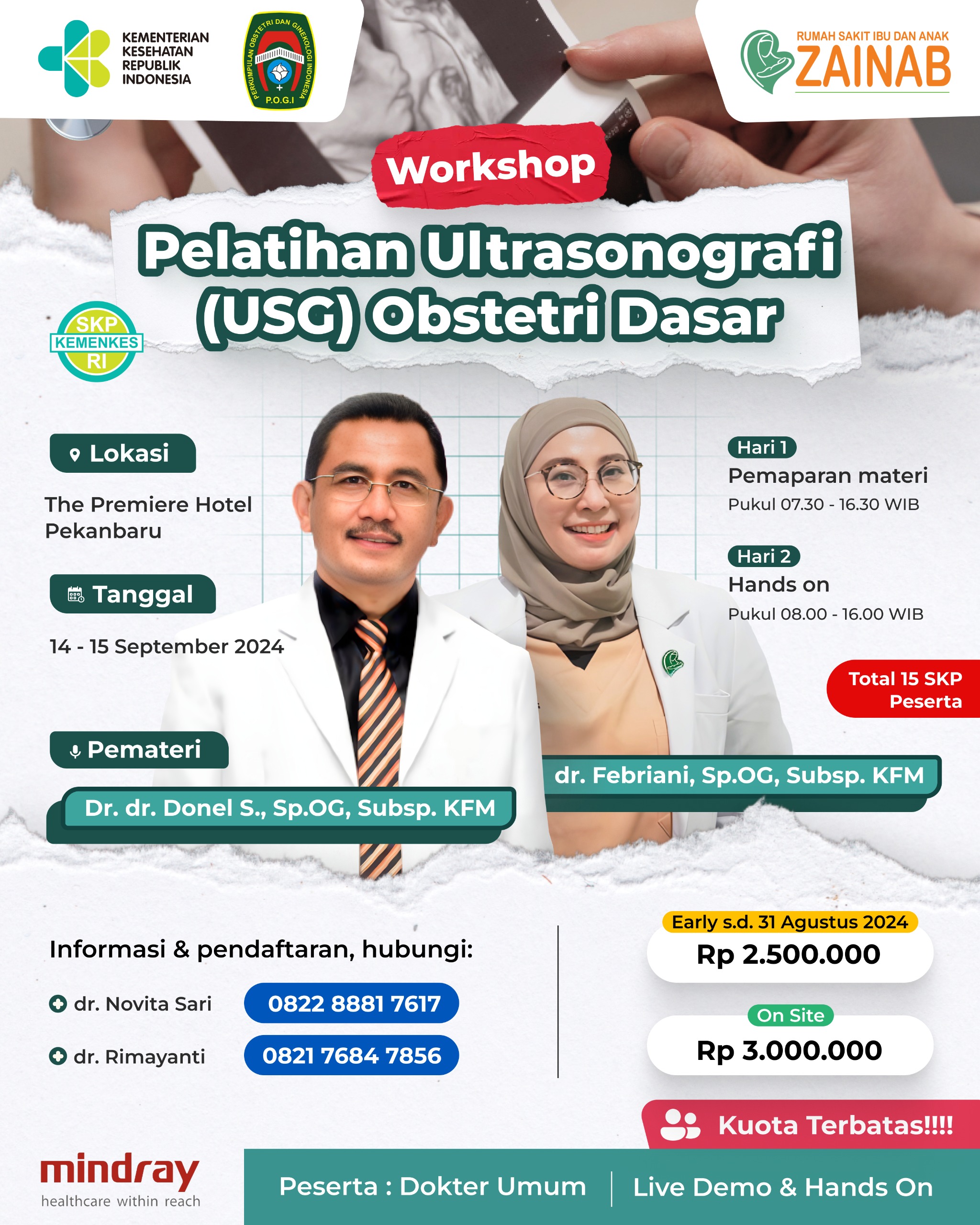 Apakah Anda seorang tenaga medis yang ingin menguasai USG obstetri? Jangan lewatkan kesempatan emas ini! Kami mengundang Anda untuk bergabung dalam Workshop USG Obstetri Dasar selama dua hari yang akan diadakan di The Premiere Hotel Pekanbaru.