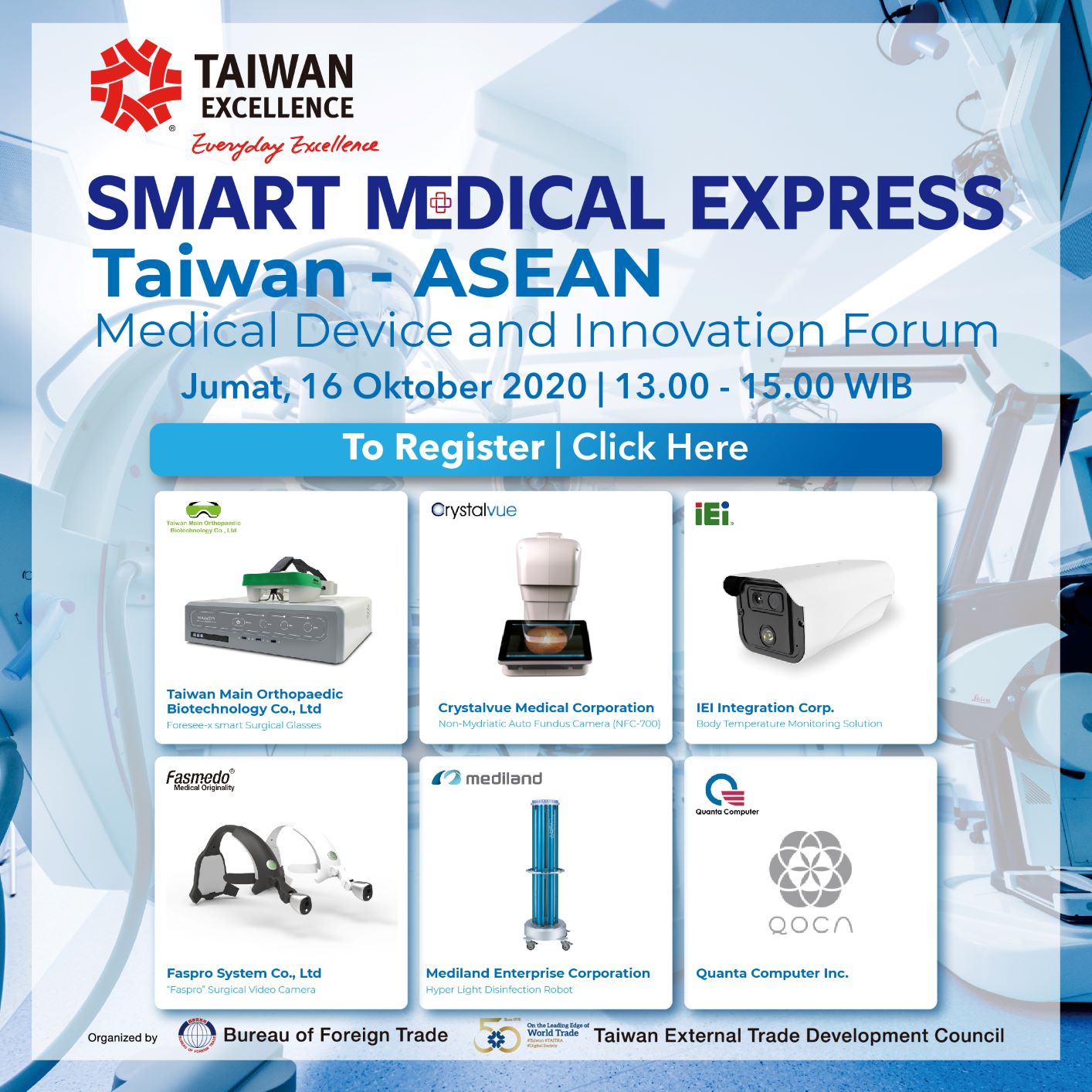 Taiwan - ASEAN Medical Device and Innovation Forum memperkenalkan produk-produk Healthcare unggulan dari TAIWAN EXCELLENCE. Akan ada 6 company terbaik dari Taiwan yang akan sharing tentang produk mereka, seperti : Orthopaedic Biotechnology, Crystalvue, iEi, Mediland, Faspro, dan Quanta