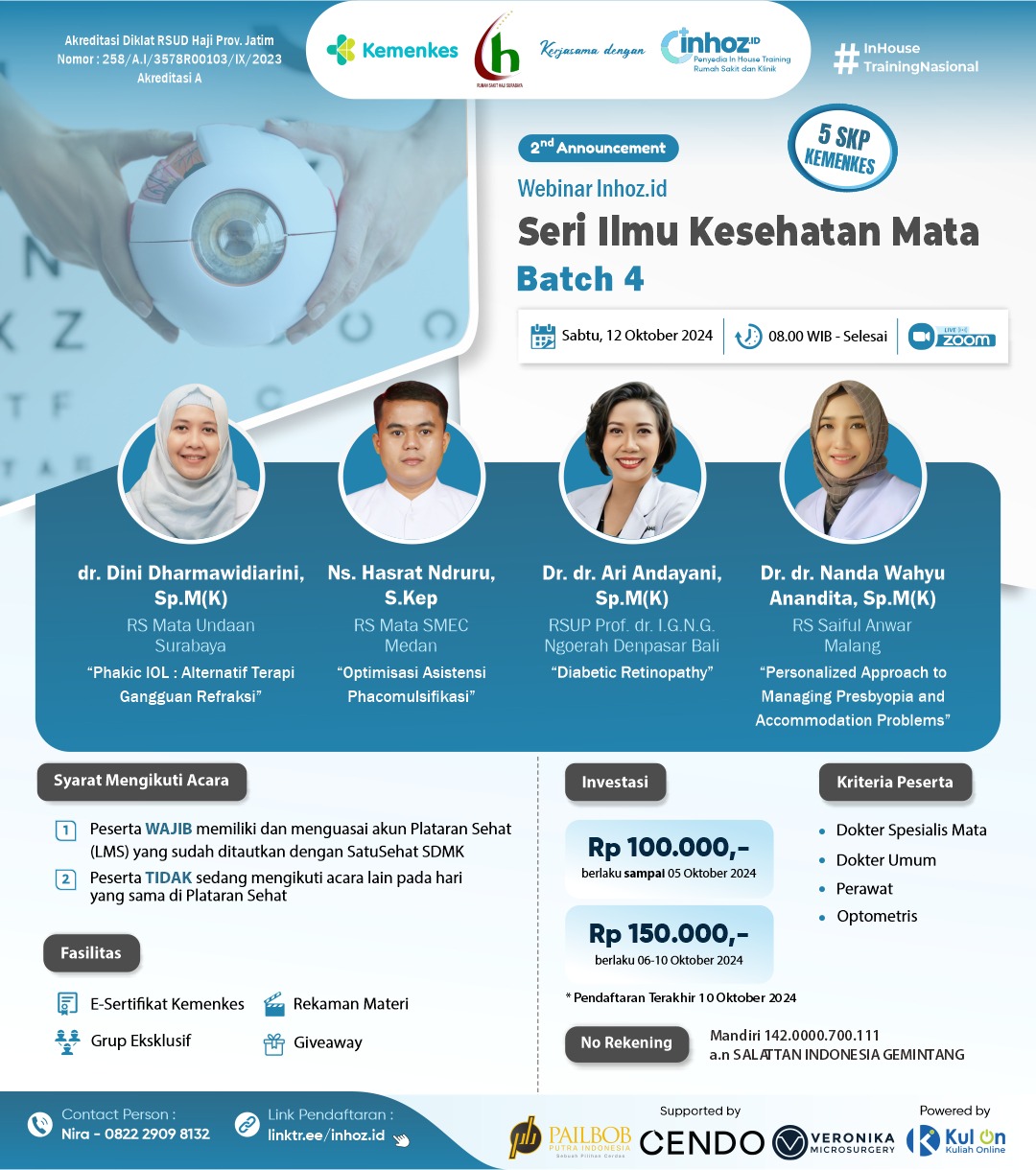 Dalam upaya meningkatkan pemahaman dan keterampilan di bidang oftalmologi, Inhoz.id mempersembahkan Webinar Seri Ilmu Kesehatan Mata Batch 4