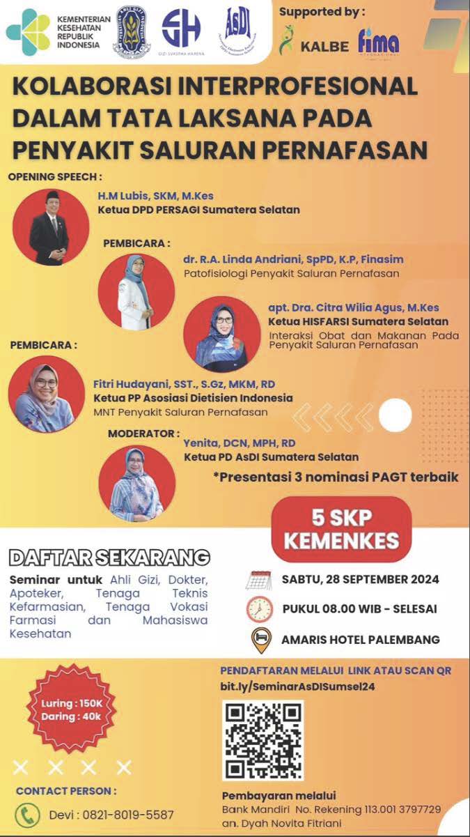Kami mengundang Ahli Gizi, Dokter, Apoteker, Tenaga Teknis Kefarmasian, Tenaga Vokasi Farmasi serta Mahasiswa Kesehatan untuk mengikuti serta mendaftakan diri di seminar kali ini!!