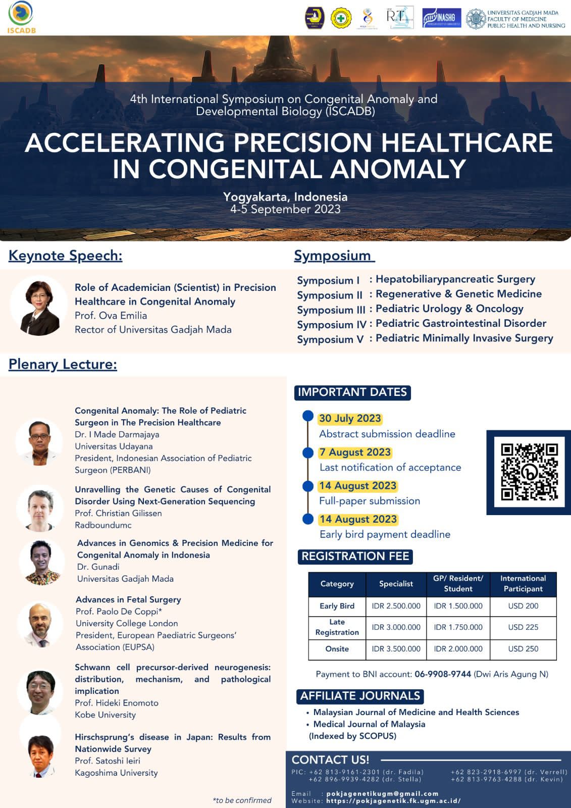 Faculty of Medicine, Public Health, and Nursing, Universitas Gadjah Mada will host the 4th International Symposium on Congenital Anomaly and Developmental Biology (ISCADB) with the theme "Accelerating Precision Healthcare in Congenital Anomaly"
