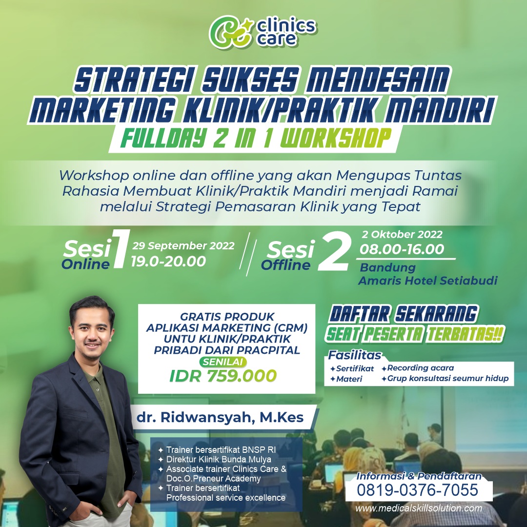 Workshop yang akan mengupas tuntas rahasia membuat klinik/praktik Mandiri menjadi ramai melalui strategi pemasaran Klinik yang Tepat.