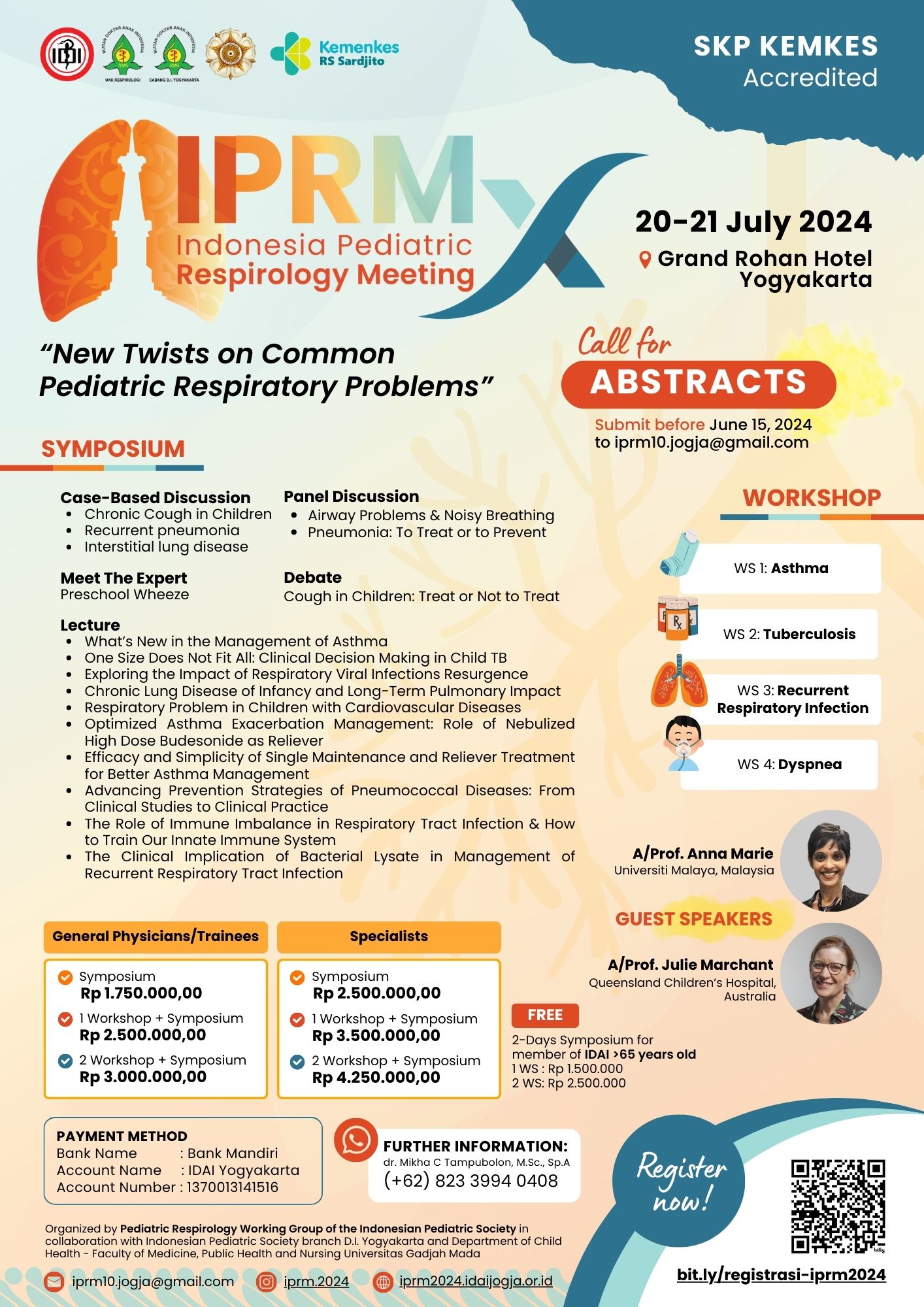 UKK Respirologi IDAI berkolaborasi dengan IDAI cabang DI Yogyakarta dan Departemen Ilmu Kesehatan Anak FK-KMK UGM akan melaksanakan Indonesia Pediatric Respirology Meeting ke-10 (IPRM) pada tanggal 20-21 Juli 2024 di Grand Rohan Hotel Yogyakarta. Rangkaian acara berupa Simposium dan Workshop yang diperuntukan bagi dokter spesialis anak dan dokter umum. Dengan tema yang diangkat, IPRM akan membahas tentang pneumonia, asma, tuberkulosis, dan penyakit respiratori anak lain yang kerapkali ditemukan oleh para dokter. Model simposium akan lebih interaktif (case based lecture, meet the expert, debate, panel discussion) dan didasarkan pada masalah-masalah yang sering dijumpai pada praktik sehari-hari, yang akan disampaikan oleh ahli respirologi anak. Acara ini juga mendatangkan langsung profesor respirologi anak dari Malaysia dan Australia. Topik workshop meliputi asma, tuberkulosis, recurrent respiratory infection, dan dispnea yang juga akan dipandu oleh para ahli dari UKK respirologi. IPRM juga membuka kesempatan untuk presentasi oral ataupun poster, melalui Abstract Submission sampai 15 Juni 2024. Kegiatan ini terakreditasi SKP Kemkes dengan penyelenggara LMS Plataran Sehat oleh Diklat RSUP Dr. Sardjito.