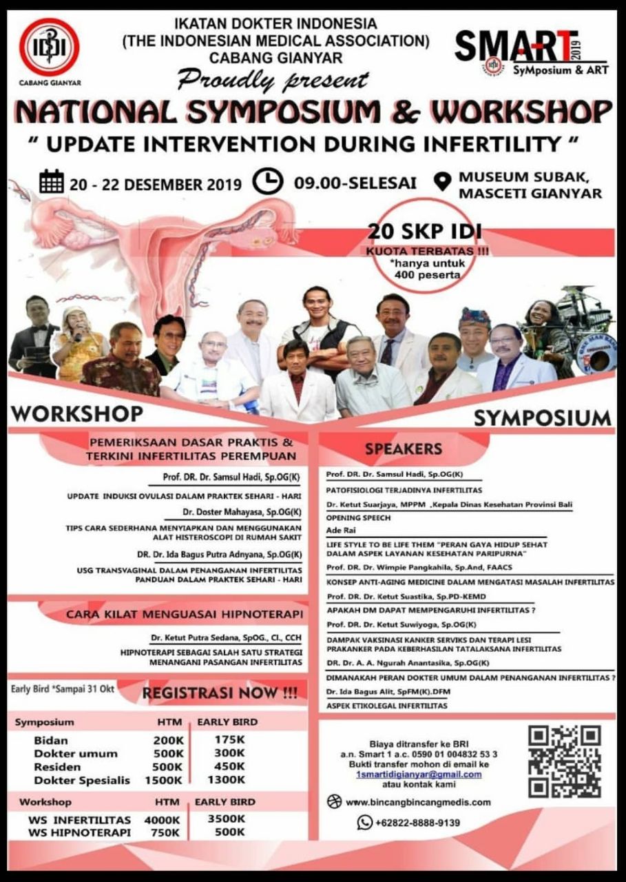 Ikatan Dokter Indonesia Cabang Gianyar melaksanakan National Symposium & Workshop dengan mengangkat tema "Update Intervention During Infertility". National Symposium & Workshop ini akan melibatkan Divisi Infertilitas Fakultas Kedokteran Universitari Udayana / RSUP Sanglah dan beberapa narasumber nasional lainnya. Melalui acara ini diharapkan terwujudnya masyarakat Indonesia yang sehat dan meningkatkan pengetahuan tentang Infertilitas baik pencegahan dan penanganannya