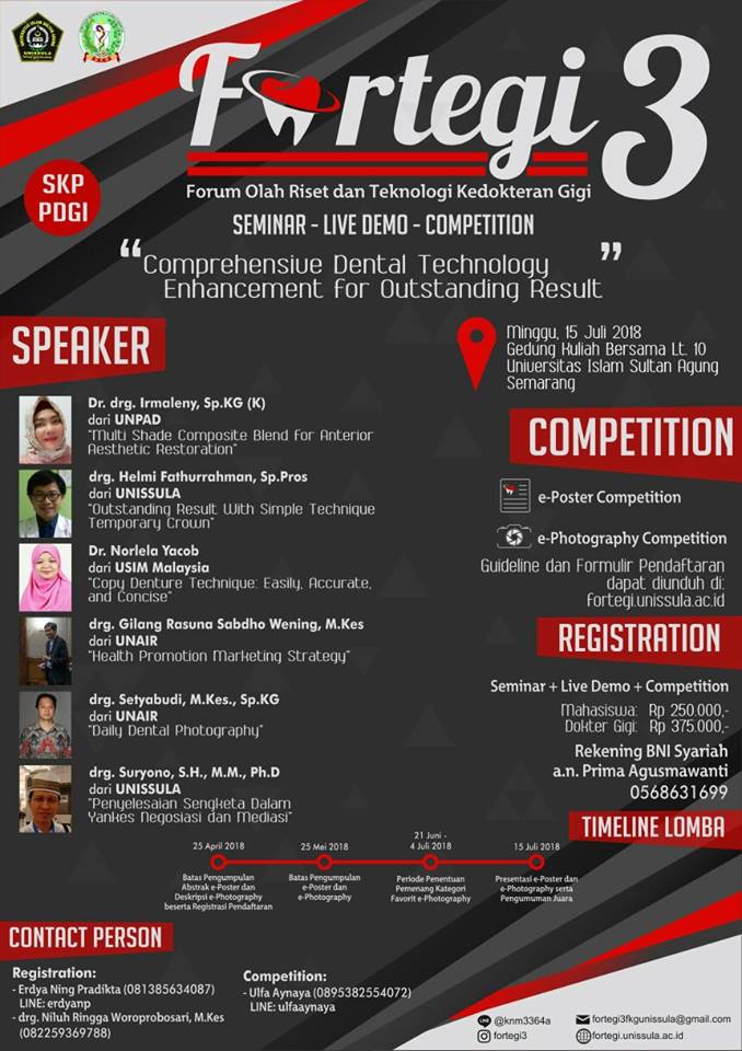 FKG Universitas Islam Sultan Agung Semarang proudly present: FORTEGI 3 2018 (Forum Olah Riset dan Teknologi Kedokteran Gigi), Merupakan acara seminar, Live Demo, dan Kompetisi dalam bidang teknologi kedokteran gigi. “Comprehensive Dental Technology Enhancement for Out Standing Result” Diselenggarakan pada: Hari/Tanggal: Minggu, 15 Juli 2018 Tempat : Gedung kuliah bersama Lt.10 Universitas Islam Sultan Agung Semarang. Pembicara Seminar: 1. Dr. drg. Irmaleny, Sp.KG (K) (UNPAD) "Multi Shade Composite Blend for Anterior Aesthetic Restoration" 2. drg. Helmi Fathurrahman, Sp. Pros (UNISSULA) "Outstanding Result with Simple Technique Temporary Crown" 3. Dr. Norlela Yacob (USIM Malaysia) "Copy Denture Technique : Easy, Accurate, and Concise" 4. drg. Gilang Rusuna Sabdho Wening, M.kes (UNAIR) "Health Promotion Marketing Strategy" 5. drg. Setyabudi, M.kes., Sp.KG (UNAIR) "Daily Dental Photography" 6. drg. Suryono, S.H., M.M., Ph.D (UNISSULA) "Penyelesaian Sengketa dalam Yankes; “Negosiasi dan Mediasi" Fasilitas seminar: Seminar kit Sertifikat Konsumsi Competition: : e-poster competition : e-photography competition Formulir pendaftaran dapat diunduh di: fortegi.unissula.ac.id Informasi lebih lanjut untuk competition: : Ulfa Aynaya (0895382554072)/Line: ulfaaynaya Prize: Penghargaan piala Penghargaan piagam Hadia Jutaan Rupiah HTM: Mahasiswa : Rp 250.000 Dokter gigi : Rp 375.000 Pembayaran melalui: Rekening BNI Syariah: a.n Prima Agusmawati (0568631699) Info lebih lanjut untuk registration dapat menghubungi : Erdya Ningpradikta : 081385634083 /Line: erdyanp drg. Niluh : 082259369788 come and join us! See you there. Be ready for it ! #fortegi2018 #fortegi3