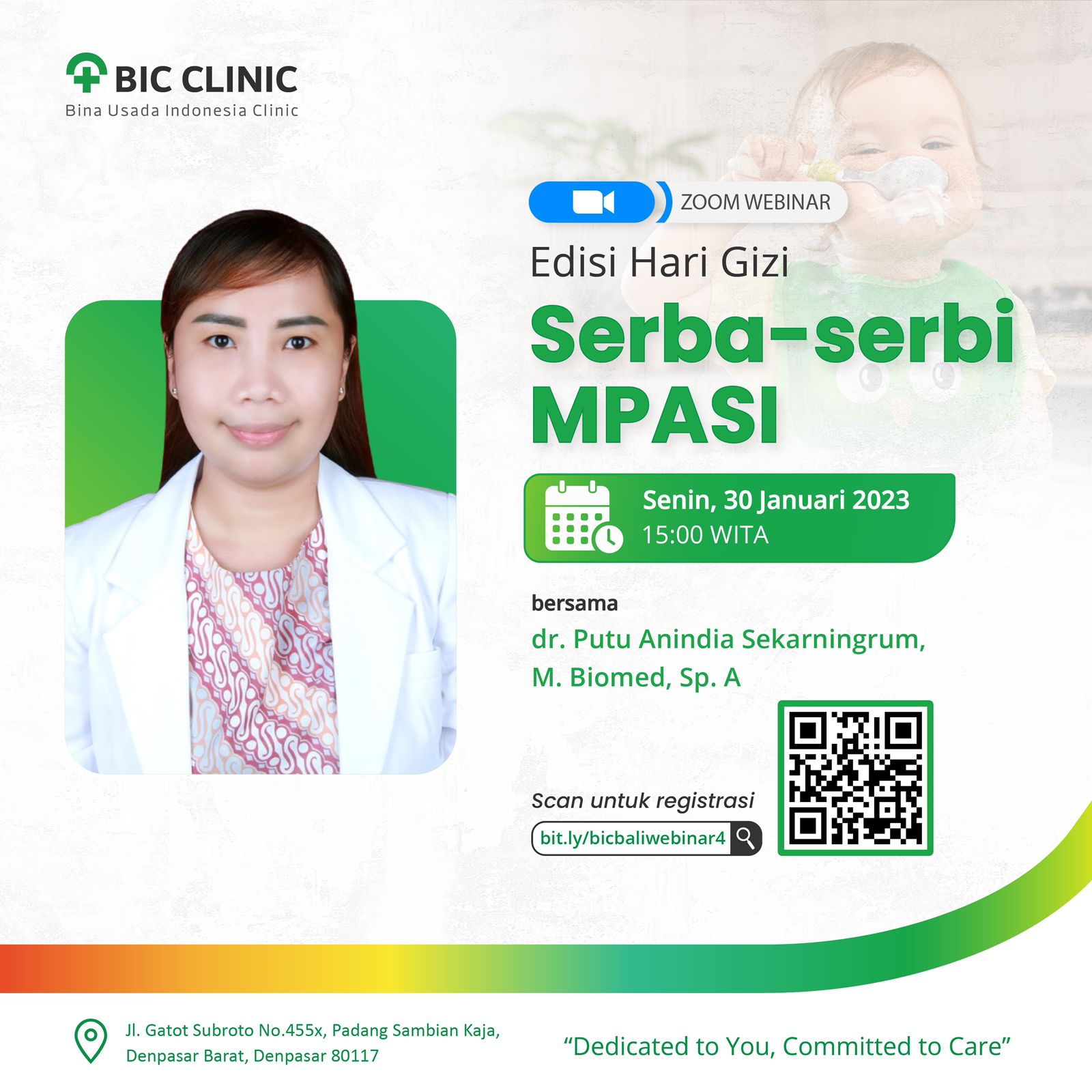 Dalam rangka Hari Gizi, BIC Clinic ingin mengundang Moms dalam webinar kali ini mengenai "Serba-serbi MPASI" bersama dr. Putu Anindia Sekarningrum, M. Biomed, Sp. A pada: