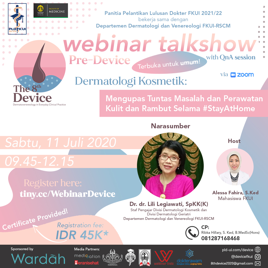 Jangan khawatir, karena Panitia Pelantikan Lulusan Dokter UI 2021/22 bekerja sama dengan Departemen Dermatologi dan Venereologi FKUI-RSCM mengadakan seminar berbasis web (webinar) Pre-DEVICE akan segera hadir dengan topik